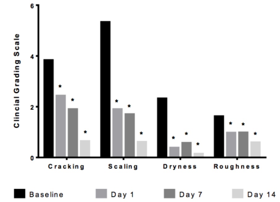 Hình 2. Tại các mốc thời gian đánh giá, các thông số cho thấy những cải thiện đáng kể về tình trạng nứt nẻ, đóng vảy, khô và thô ráp.