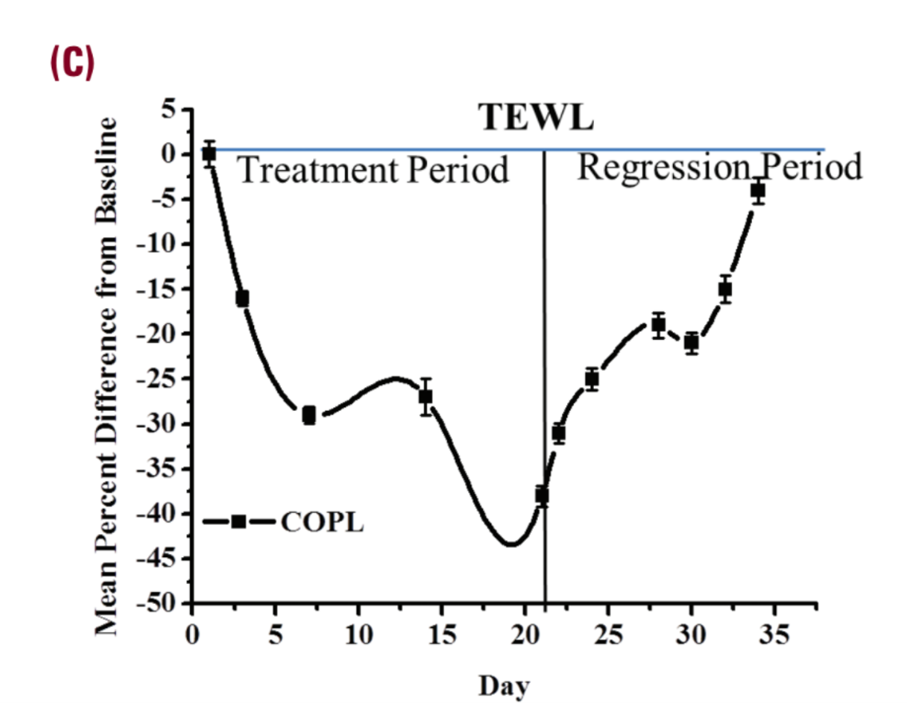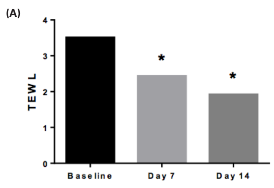 Hình 3. Mức độ thoát hơi nước qua biểu bì (TEWL) giảm đáng kể sau 14 ngày sử dụng lotion có chứa chiết xuất keo yến mạch.