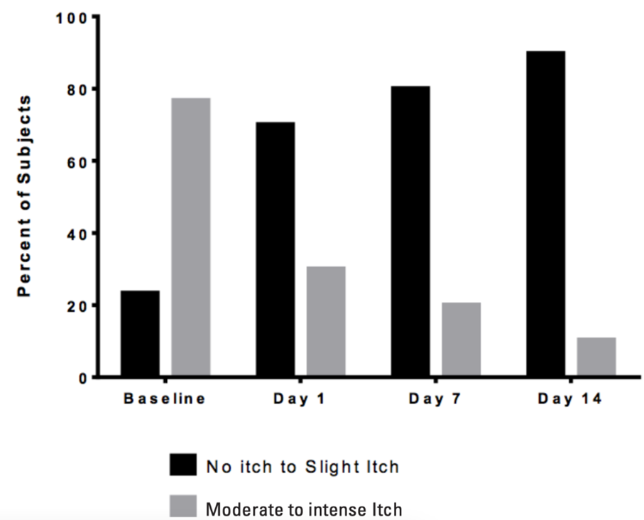 Cụ thể là ngày đầu tiên, khoảng 77% bệnh nhân có tình trạng ngứa vừa, 23% ngứa nhẹ. Sau 14 ngày, chỉ còn khoảng 10% đối tượng nghiên cứu vẫn còn ngứa mức độ vừa, 90% còn lại đã hết ngứa da hoặc ngứa nhẹ.
