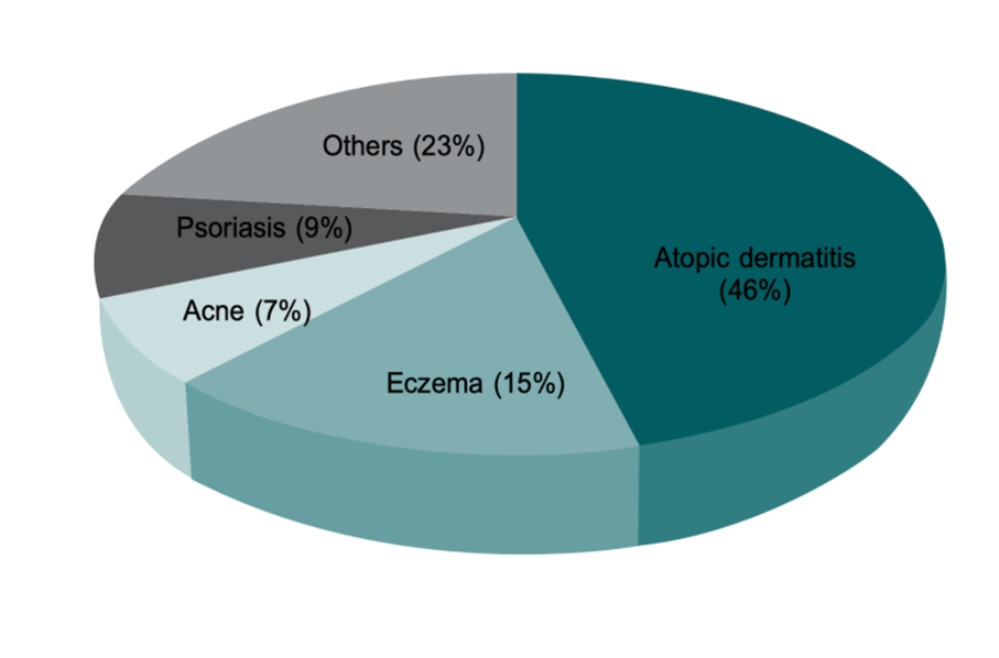 Trong đó có 46% bị viêm da dị ứng, 15% bị chàm, 9% bị bệnh chàm, 7% bị mụn trứng cá và 23% đối tượng còn lại bị các triệu chứng khác như khô da, ngứa,...