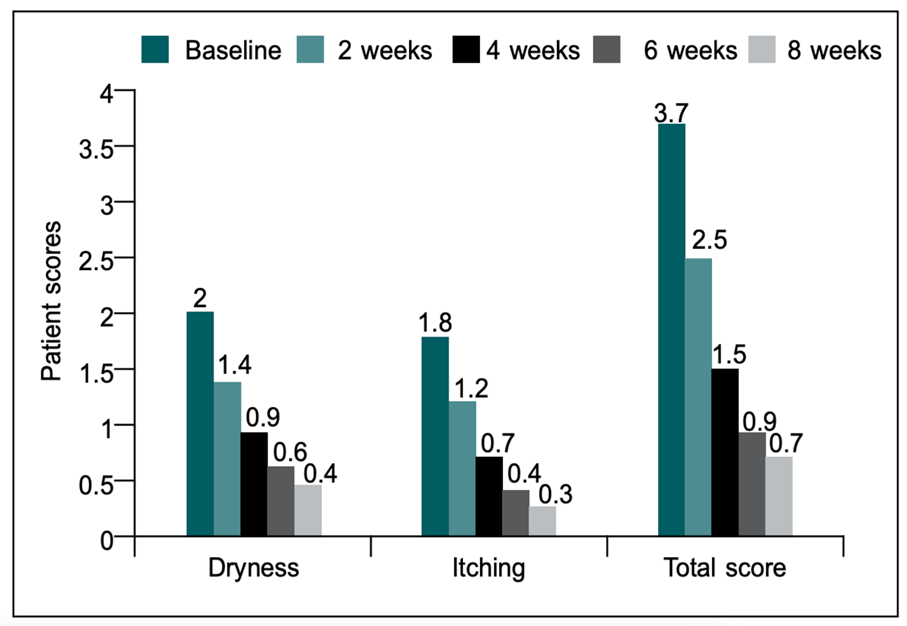 Điểm tổng thể về độ khô da ban đầu của bệnh nhân là 2, sau 2 tuần giảm xuống 1,4, sau 4 tuần còn 0,9, sau 6 tuần còn 0,5 và còn 0,3 vào tuần cuối cùng - tuần thứ 8. Tương tự, ngứa đã giảm ở tất cả các bệnh nhân khi kết thúc nghiên cứu; tổng điểm đánh giá của các bệnh nhân được trình bày trong Hình 6.