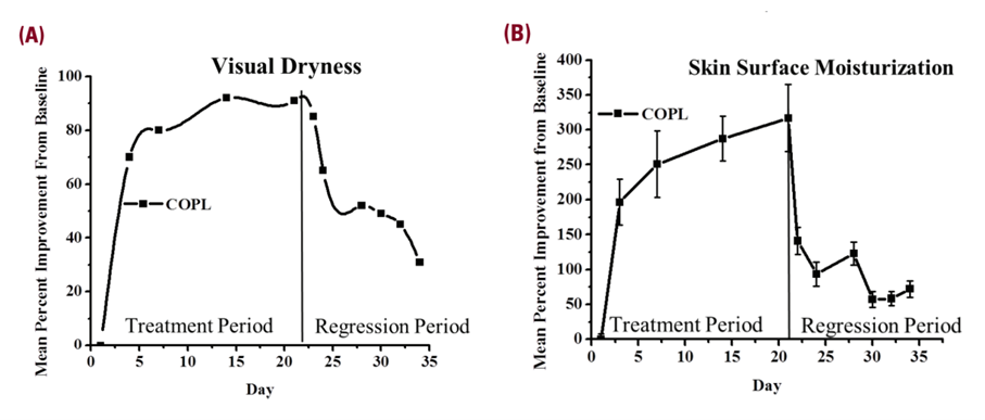 Vào giai đoạn 2 tuần không sử dụng kem dưỡng, giá trị dưỡng ẩm vẫn cao hơn đáng kể so với ban đầu. Hơn nữa, các giá trị về mức độ khô da, độ ẩm và mức độ thoát hơi nước qua biểu bì có giảm xuống sau khi ngưng điều trị, tuy nhiên vẫn nhận thấy là có sự cải thiện so với ban đầu.