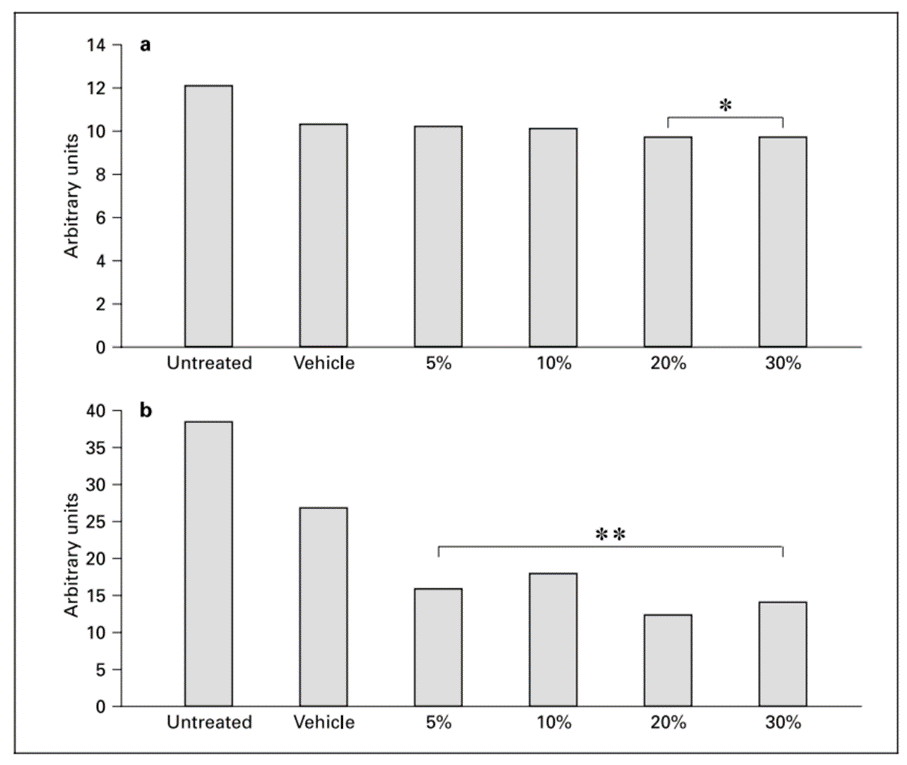 Khảo sát ảnh hưởng của Avena Rhealba ở nồng độ tăng dần (5, 10, 20 và 30%) và petrolatum ointment (vehicle) đối với thông số chromametric (sắc độ - là biểu hiện của tình trạng mẫn đỏ) (a) và lưu lượng máu qua da (b), trong mô hình kích ứng da do SLS, được biểu diễn ở Hình 8.