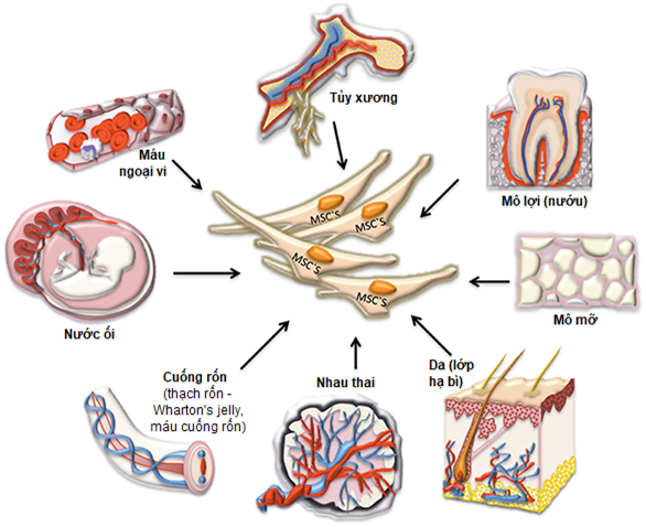 MSC có thể được thu nhận từ nhiều nguồn khác nhau như tủy xương, mô mỡ, dây rốn, tủy răng sữa,… MSC có khả năng biệt hóa thành các tế bào thuộc mô liên kết như mỡ, cơ, xương, sụn,… ngoài ra có thể biệt hóa thành nhiều loại tế bào khác có nguồn gốc từ cả ba lá phôi như tế bào thần kinh, gan, thận,… Điều này mang lại triển vọng lớn cho việc ứng dụng MSC vào y học tái tạo.